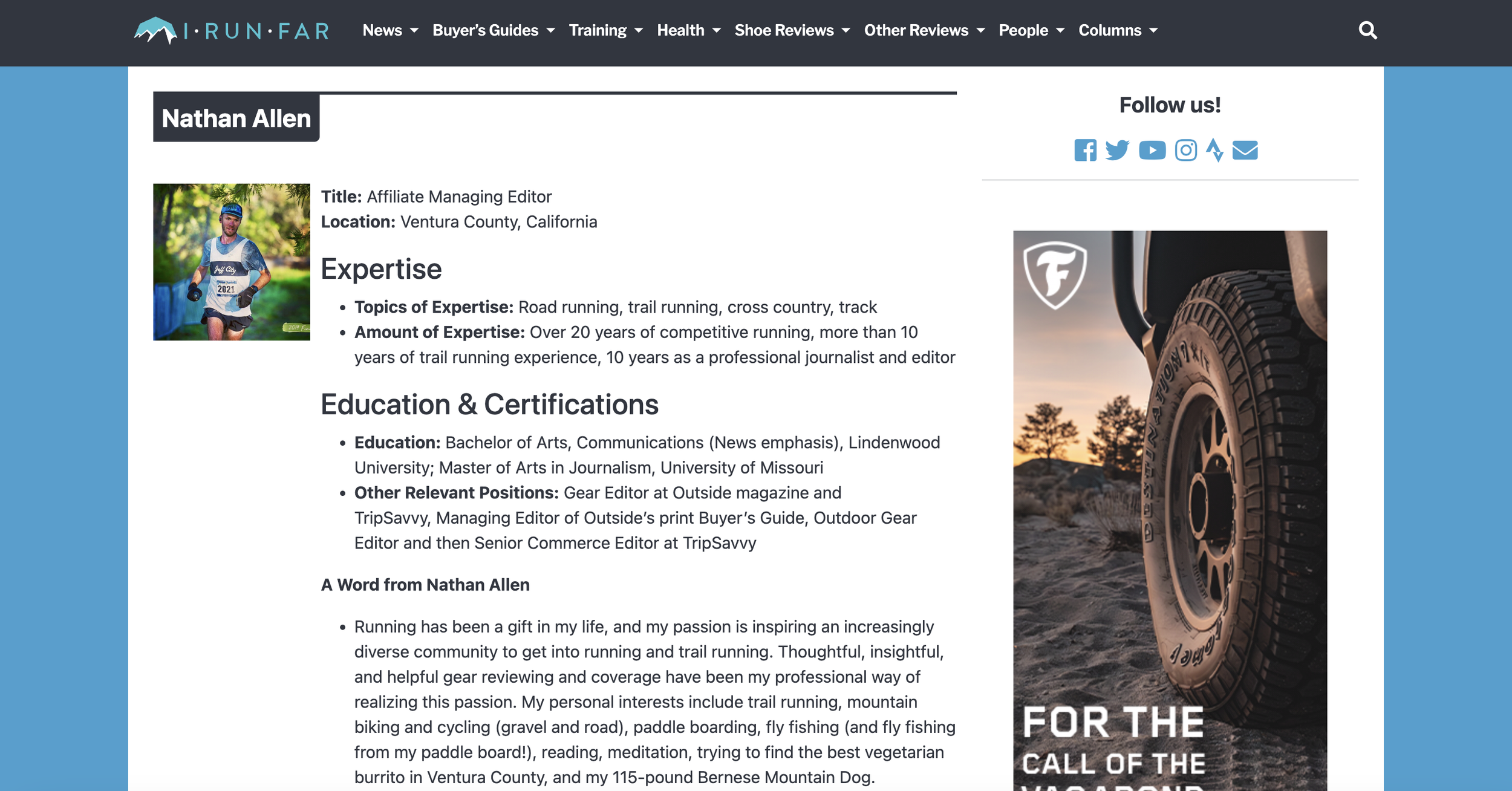Check out my writing work at iRunFar, where I was the Affiliate Managing Editor. Most of my work was as a managing editor, assigning, editing, publishing, strategizing, planning editorial content, and coordinating product testing.